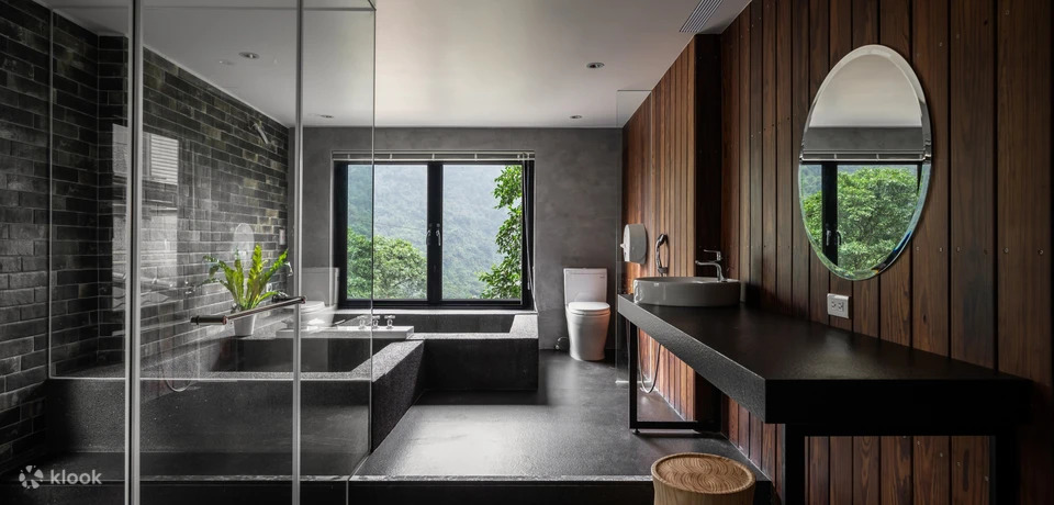 烏來旅晨溫泉民宿位於烏來制高點,山景遼闊、可俯視烏來老街,清晨還有日出美景。簡約現代風湯屋配進口手工磁磚、大理石製冷熱水池,體驗泡湯新美學,提供芳療規格的一日茶道沐浴用品,不用出國便能感受日本風情。