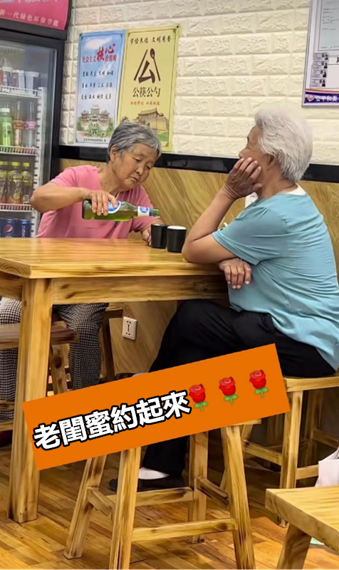 ▼那名網友忍不住將兩位老人相約暢飲的畫面拍下來,並po到網路上,很快就引發討論。大部分網友都覺得2位老奶奶洒脫又豪邁,人到老年還有相約一起喝酒的朋友,實在讓人非常羨慕。