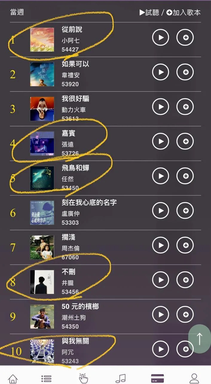 ▼原po貼出的照片是錢櫃10月25日至31日的「國語點播排行」,前10名分別是小阿七〈從前說〉、韋禮安〈如果可以〉、動力火車〈我很好騙〉、張遠〈嘉賓〉、任然〈飛鳥和蟬〉、盧廣仲〈刻在我心底的名字〉、周杰倫〈擱淺〉、井朧〈不刪〉、潮州土狗〈50元的檳榔〉、阿冗〈與我無關〉。
