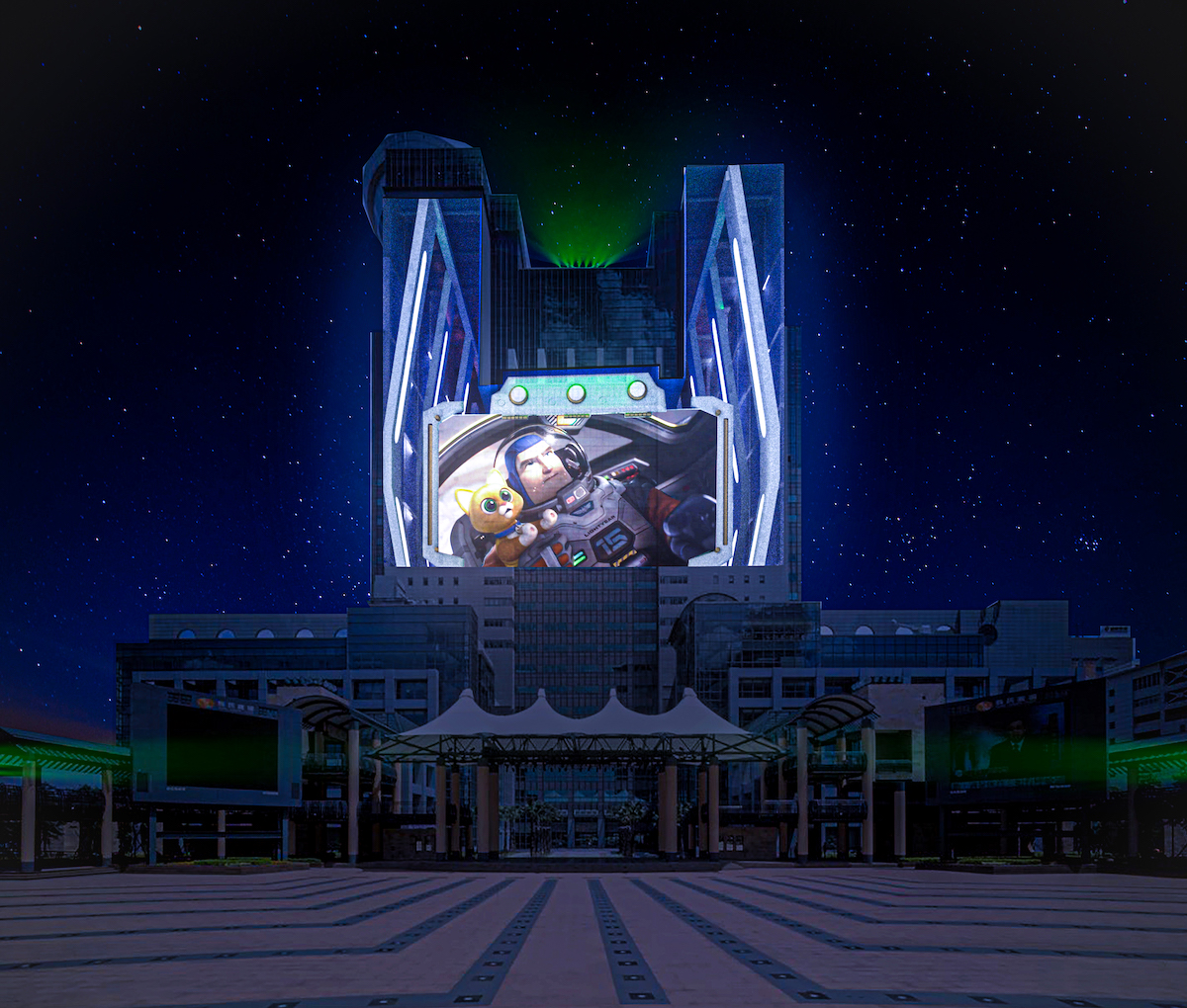 ▼新北廣場的「全臺面積最大光雕投影秀」,則是以新北市府北面牆面為載體,盛大登場!今年光雕投影主題結合Disney+六大品牌主題,更特別將「北極光」搬進新北耶誕城,以煙霧機營造極光雲海特效,照耀到北面牆面妝點的冰晶雪花,好像真的有極光、下起了雪。