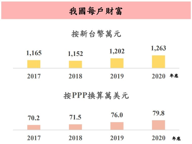 ▼主計總處分析,主要是因為金融性資產淨值增55萬元,其中每戶「有價證券」增37萬元、「現金及活期性存款」增25萬元所致;較2017年底亦增98萬元或8.4%。如果依購買力評價換算,2020年底每戶財富79.8萬美元,較2019年底增3.8萬美元或5.0%,較2017年底亦增9.7萬美元或13.8%。