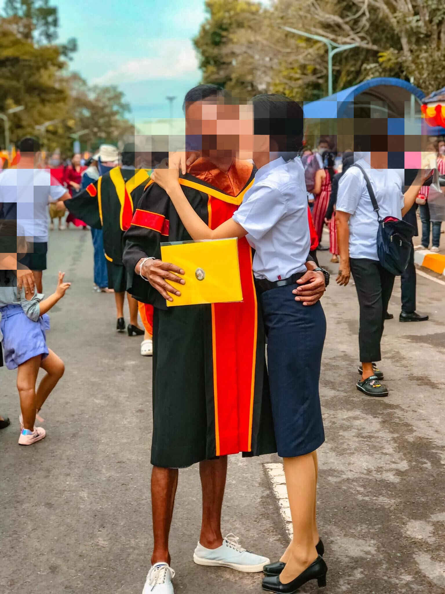 ▼據報道,這對兄妹居住在泰國洛坤府,妹妹就讀於素叻他尼皇家大學公共行政系,2018年畢業。但因為疫情的因素,延遲到現在才拿到畢業證書。畢業當天,妹妹跟其他畢業生一樣,身穿學士服跟家人合照,她決定做一些特別的事情來感謝哥哥。