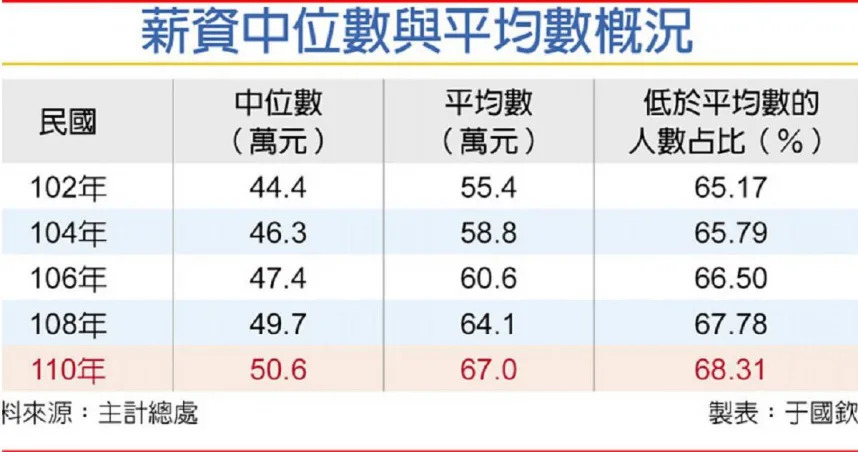 主計總處指出,2021年受僱員工全年總薪資(含經常性與獎金等非經常性薪資)的中位數為50.6萬元,較2020年增加0.5萬元。全年平均薪資則為67萬元,較前年增加2萬元。不過這份資料還顯示,全體受僱員工中「薪資小於平均數67萬元」占比高達68.31%,較去年提升0.43個百分點,創下歷年來新高。