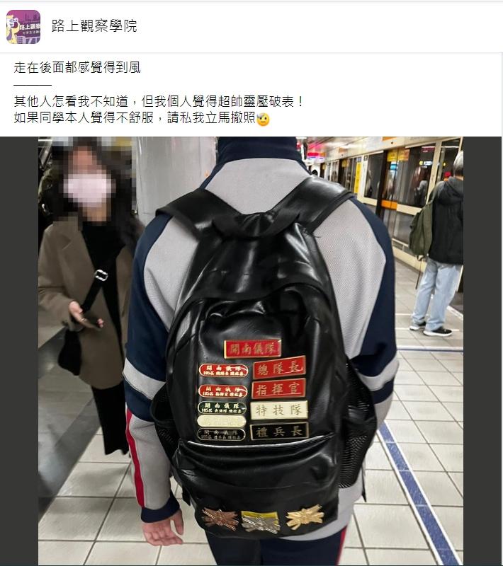 原po在臉書社團「路上觀察學院」分享一張照片,只見一名高中生穿著制服走在捷運站內,後背包上竟掛了滿滿2排儀隊勳章。不僅有「開南儀隊」的標誌,還有「總隊長」、「指揮官」、「特技隊」、「禮兵長」等等。原po看到後直呼:「走到後面都感覺得到風!其他人怎看我不知道,但我個人覺得超帥靈壓破表!」