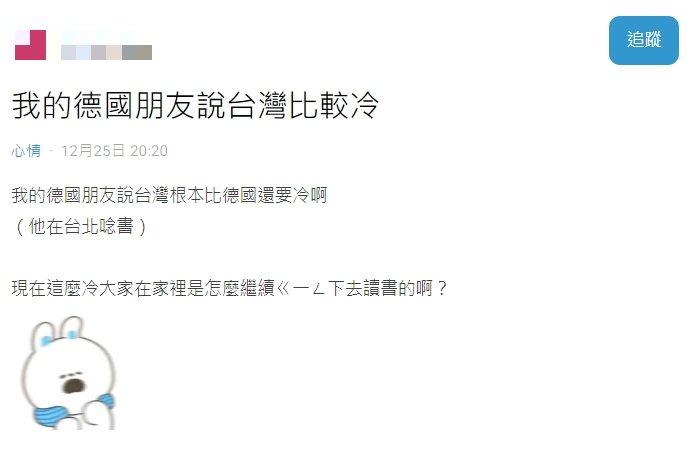 一名網友在Dcard發文說,他有一名德國朋友,來台灣念書後向他抱怨,「台灣根本比德國還冷」。近期寒流一波接著一波,原po也不禁好奇,「現在這麼冷,大家在家裡是怎麼繼續ㄍ一ㄥ下去讀書的啊?」
