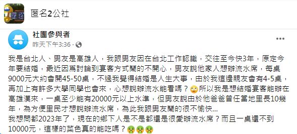 這名女網友在臉書社團「匿名2公社」發文說,她是台北人,男友是高雄人,兩人都在台北工作,現在已經交往近3年,也有了結婚的共識。兩人原定要在今年結婚,但最近商討結婚事宜時,卻因為宴客方式而鬧得很不愉快。