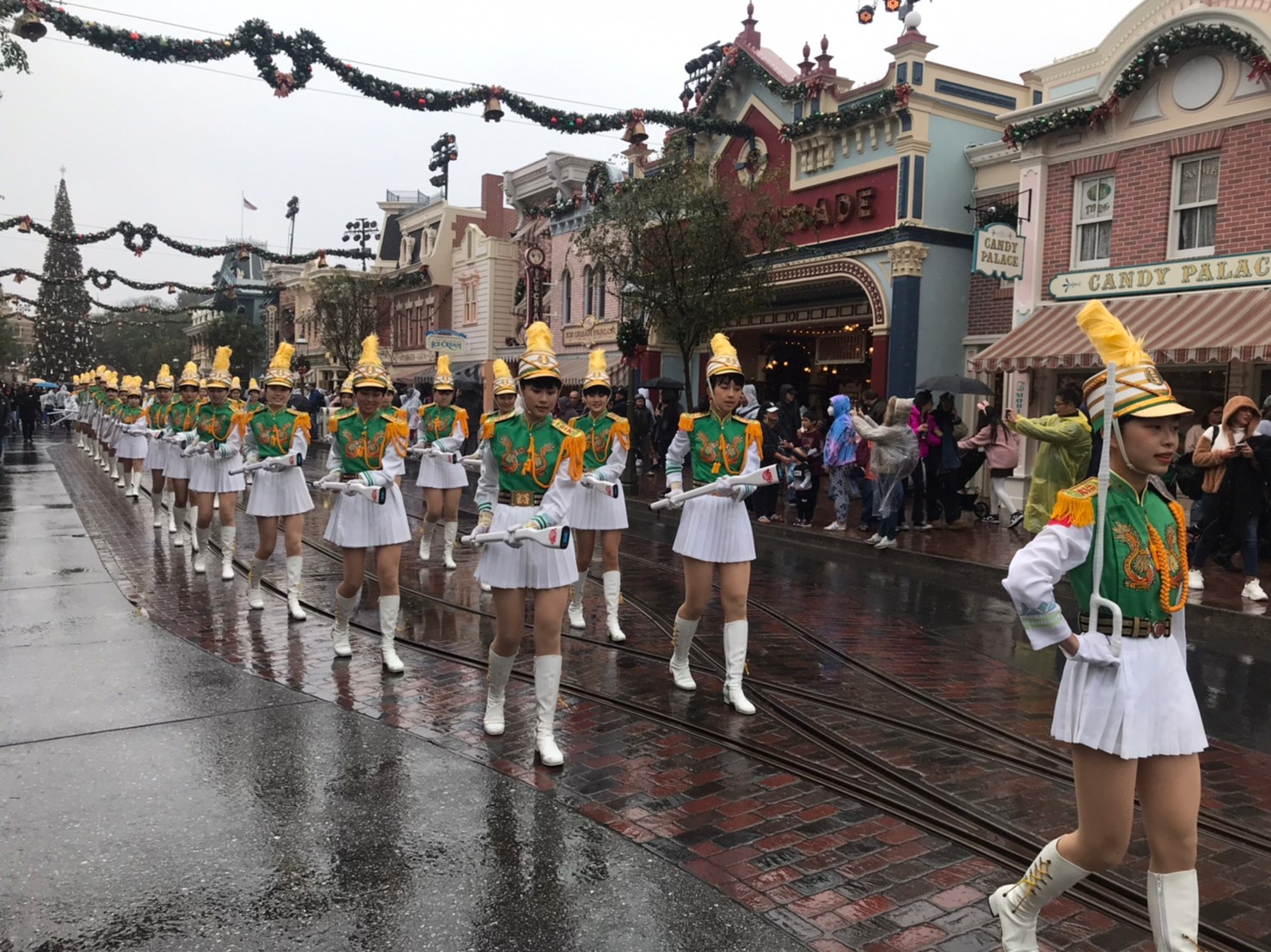 ▼加州迪士尼所在的城市安那罕(Anaheim)4日飄雨,演出前雨勢不小,園方一度考慮取消表演。提早進入園區準備的學生們也非常忐忑,深怕錯過這難得的機會,幸好最後遊行照常出發,學生們也如願完成演出。