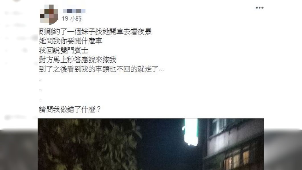 原po在臉書社團「爆怨公社」分享一張照片,並表示自己最近約女生看夜景,對方問他開什麼車,他誠實回答是「雙門賓士」。女方聽到後馬上答應,但他開車去載人時,對方一看到他的車頭,竟頭也不回就離開了,留下他一個人難過又迷惑。