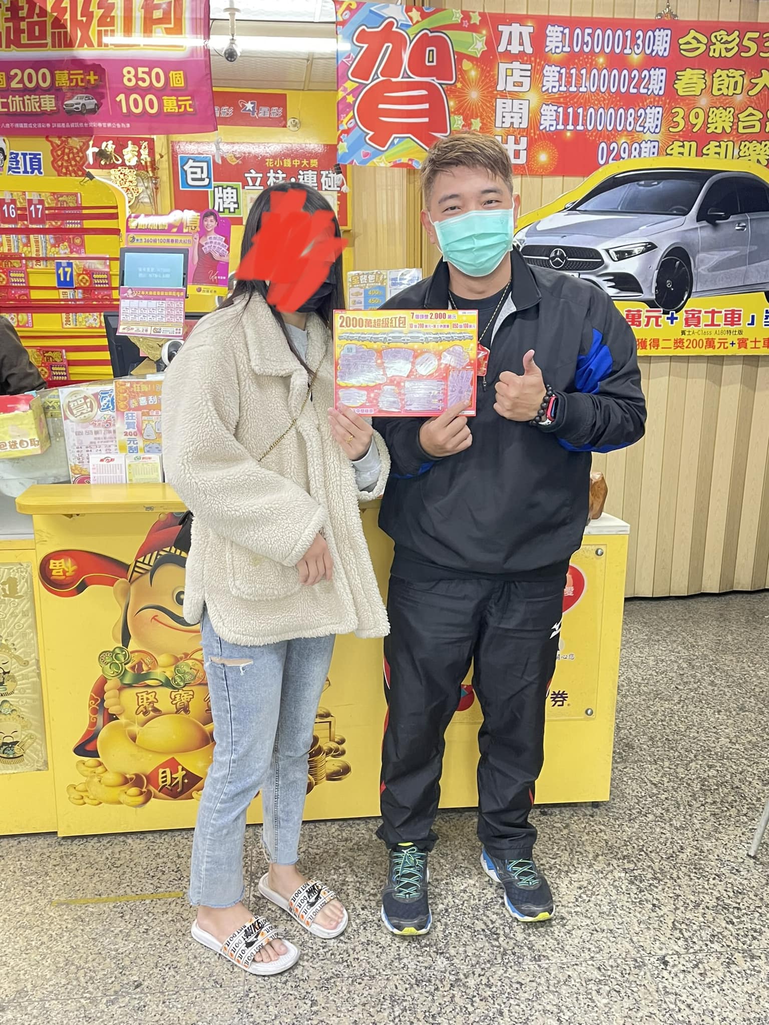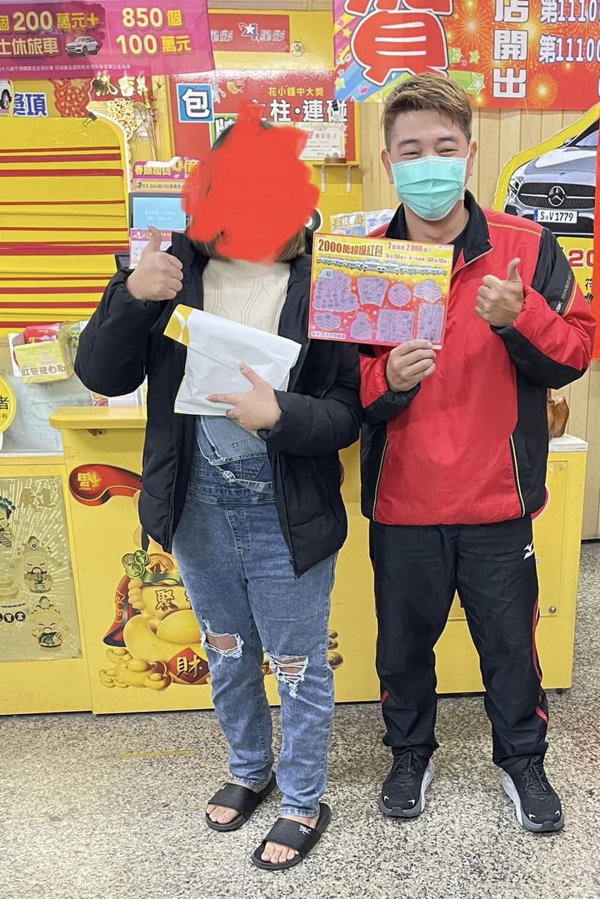 ▼「吉時發彩券行」從年前就開始宣傳「2000萬超級紅包」刮刮樂,獎金加碼850個100萬,還有10台賓士休旅車,歡迎民眾到店裡試試手氣。結果小年夜前一天,一對年輕情侶就超好運,刮出100萬大獎,並開心與彩券行老闆合影留念。