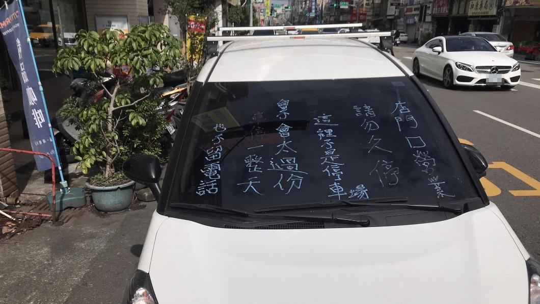▼一名網友在臉書社團「桃園爆報」發文說,這輛白色轎車停放在桃園區三民路三段、青田街口一處店家門前,前擋風玻璃上寫滿字跡,「店門口營業請勿久停,這裡不是停車場,會不會太過分,一整天也不留電話」,可見店家相當不滿。