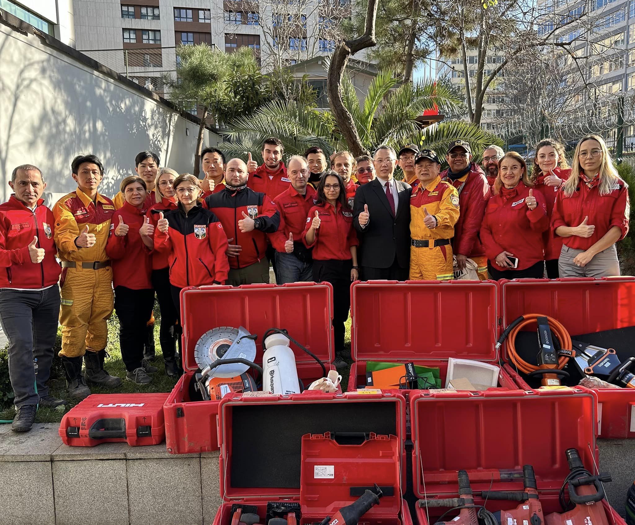 土耳其和敘利亞邊界6日發生芮氏規模7.8強震,截至目前,罹難人數已超過3萬人。台灣在第一時間派出2梯次搜救隊,共130人及5隻搜救犬到場援救,因為階段性搜救任務結束,台灣搜救隊在12日下午分批撤離。離開之前,台灣搜救隊將此行攜帶的約4噸搜救裝備器材,與外交部合作透過外交管道贈與AKUT搜救隊。