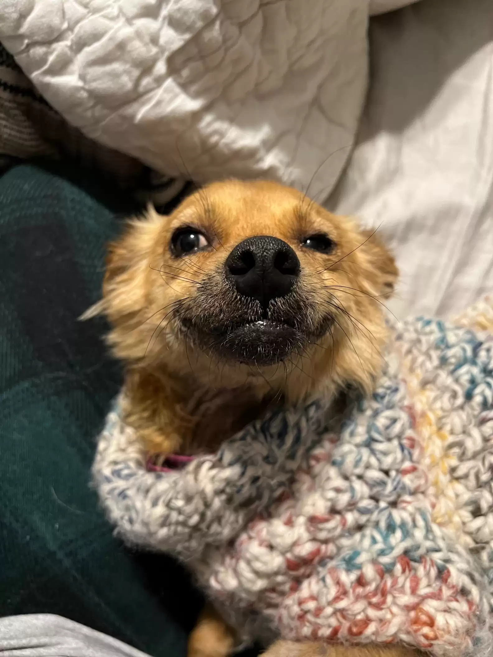 ▼被解救出來後,Smile一直表現得非常乖巧。牠蜷縮在志工們準備好的小窩里,安靜看著志工們工作,眼睛裡充滿希望,臉上還掛著招牌笑容。
