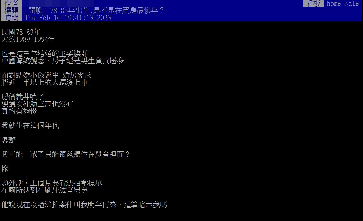 ▼這位網友在PTT發文說,他是在民國78年至83年這個區間出生的,與他差不多歲數的人這3年都面臨結婚生子的階段,但都來不及買房,房價就「井噴」了,連政府的房貸補貼方案3萬元都沒資格領。他不禁哀嚎:「真的有夠慘,怎辦?我可能一輩子只能跟爸媽住在農舍裡面?」