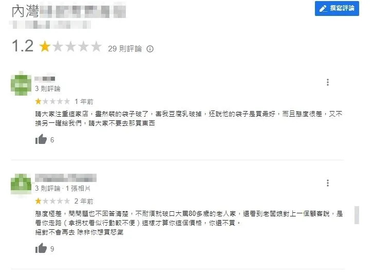 有網友查詢該店家的Google評價,只有1.3顆星,大多數人都打負評,抱怨店家把客人當盤子,「態度極差,問問題也不回答清楚,不耐煩就破口大罵80多歲的老人家,還看到老闆娘對上一個顧客說,是看你走路(拿拐杖看似行動較不便)這樣才算你這個價格,你還不買」。對此,店家解釋說,店內的豆腐乳確實沒標價,但絕無價格變動問題,而且豆腐乳都是自己做的,1罐就是賣330元。