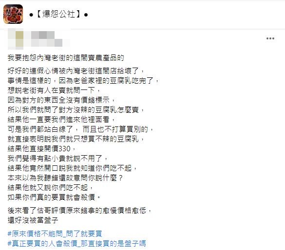 原po在臉書社團「爆怨公社」發文說,父親家裡的豆腐乳吃完了,他遊玩期間看到老街有在賣,就隨口詢問一下。那間店的豆腐乳全都沒標示價錢,於是原po客氣地詢問店家,「沒辣的豆腐乳怎麼賣?」店家聽到後一直要他們進來裡面看,但原po沒打算買別的,就直接表明說要買不辣的豆腐乳。