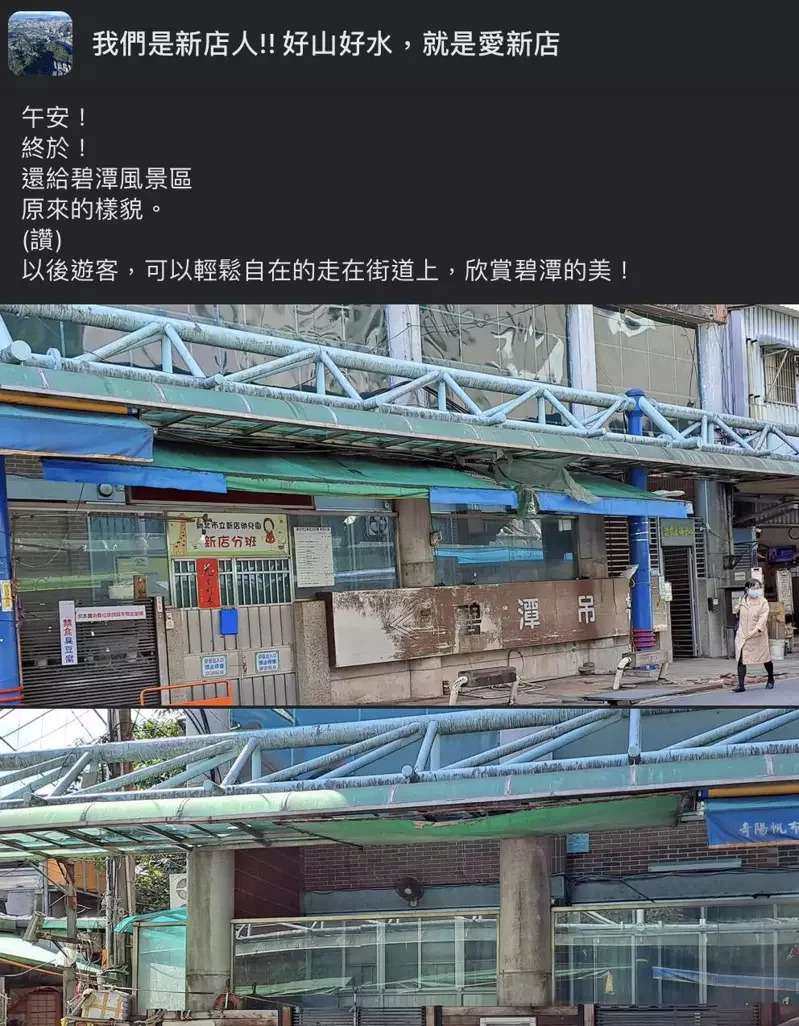日前有網友在臉書社團「我們是新店人!! 好山好水,就是愛新店」分享新店老街如今空蕩蕩,還有過去攤商林立差很大的照片,並說:「終於!還給碧潭風景區原來的樣貌(誤)。以後遊客可以輕鬆自在地走在路上,欣賞碧潭的美。」