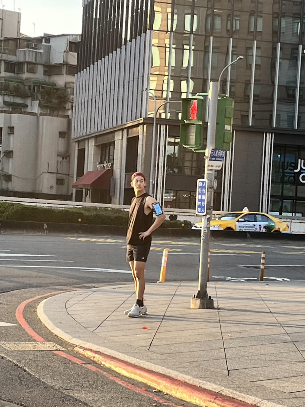 ▼從照片中可以看到,玉澤演正站在斑馬線前,似乎是在等紅燈。他穿著黑色吊嘎配運動短褲,頭上反戴著一頂紅色鴨舌帽,手臂上還戴著手機紀錄運動數據。原po興奮說:「好帥怎麼會那麼帥哈哈哈哈哈我要昏倒了!」