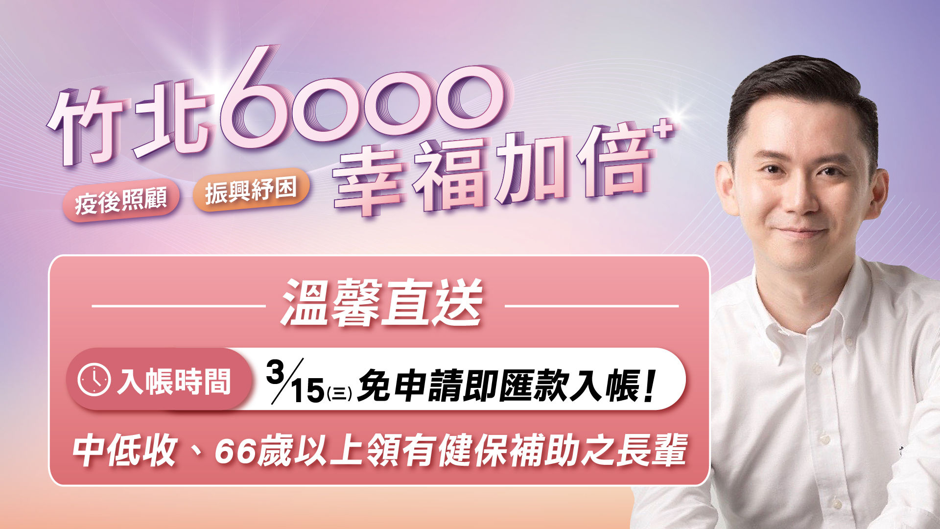 ▼鄭朝方表示,近1.3萬人已經率先領到紓困金,3月18至25日將進入第二階段「E化申請」,不用出門、不用排隊,透過竹北市公所線上申請網址(6000.zhubei.gov.tw),24小時都能線上申辦。市公所將依申請順序撥款,最慢4月4日前就會匯入民眾帳戶。最終階段4月8日至10日將進行現金普發。