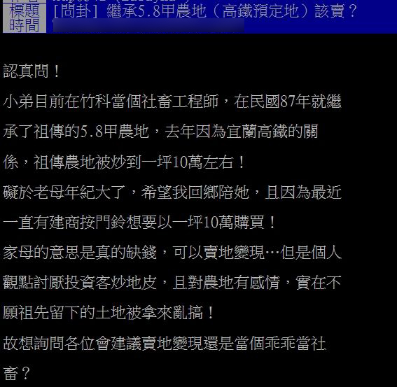 原po在PTT發文問:「繼承5.8甲農地(高鐵預定地)該賣?」他是一名竹科工程師,民國87年繼承了祖傳的5.8甲農地,去年交通部拍板定案高鐵宜蘭端站址,祖傳農地剛好是高鐵預定地。最近很多建商登門,想要以一坪10萬元的價格購買。