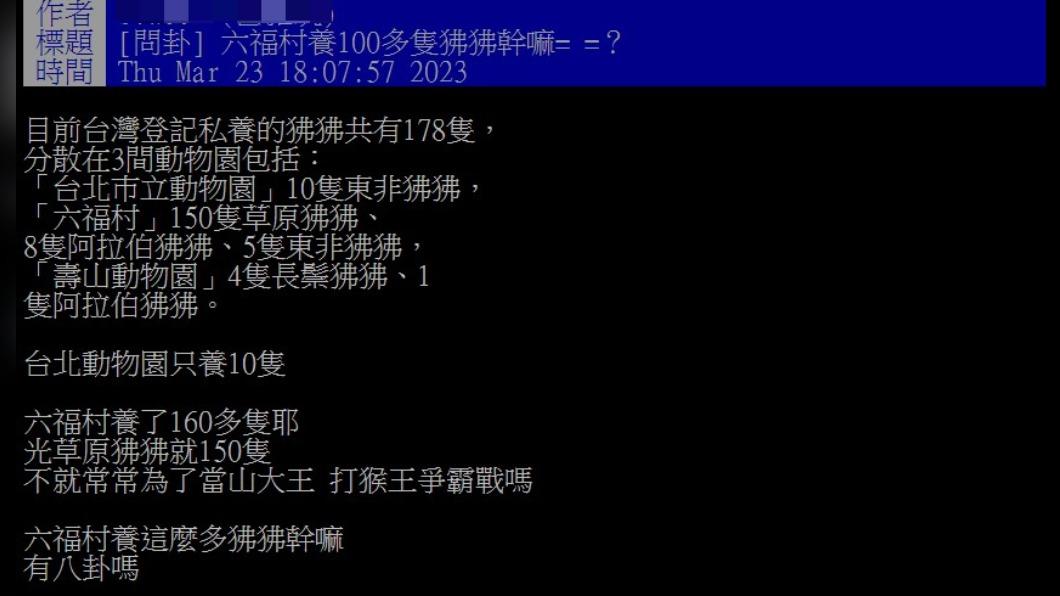 原po非常好奇,台北動物園僅飼養10隻狒狒,六福村卻養了160多隻,「光草原狒狒就150隻,不就常常為了當山大王打猴王爭霸戰嗎?」網友們看到後紛紛表示:「笑死,也太多隻」、「狒狒區比其他猛獸區還可怕」、「再下去就變六福國了」、「沒辦法,狒狒太會生」、「給觀光客看啊!很多人沒看過」。