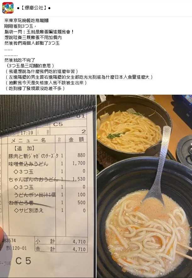 2023年10月27日清明連假期間不少人出國旅行。一名網友在臉書社團「爆廢公社」發文說,他到日本旅遊吃烏龍麵時,根據菜單上的日本漢字隨意猜測意思,看到「3つ玉」可以免費加購,以為是雞蛋,就與朋友各點一份,送上桌才發現誤會大了~