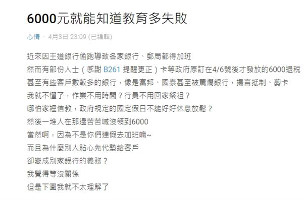 ▼這名銀行員進一步指出,政府規定的國定假日難道不能好好休息放鬆?一堆人在那邊苦苦喊沒領到6,000元,「當然啊,因為不是你們連假去加班嘛,而且為什麼別人貼心先代墊給客戶?卻變成別家銀行的義務?」