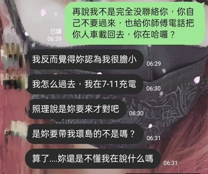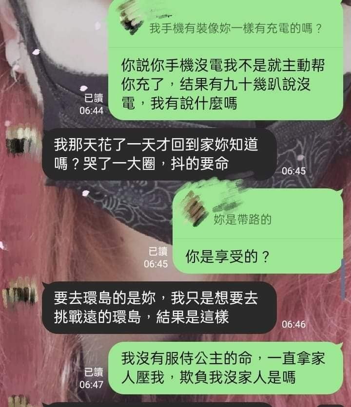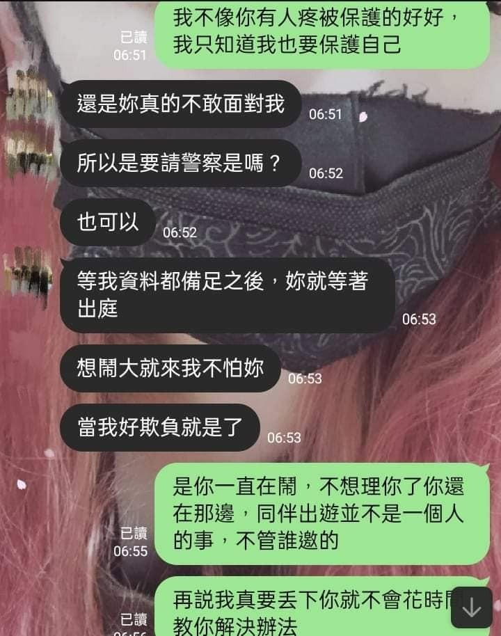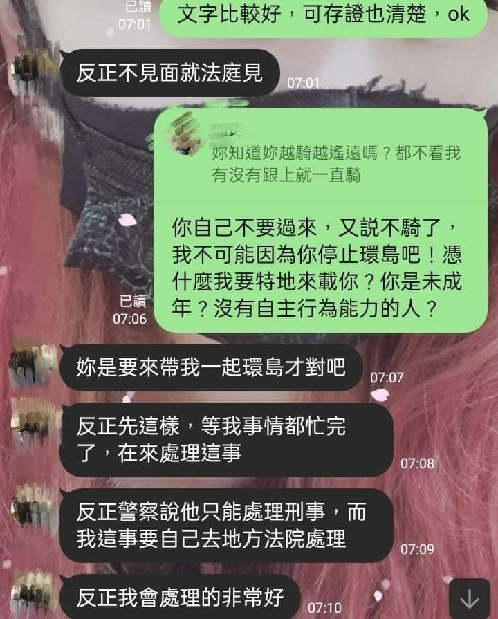 ▼事後同伴傳LINE訊息給原po:「反正不見面就法庭見」、「妳都不擔心我會不會回不了家耶」、「等我資料備足之後,妳就等著出庭,想鬧大就來,我不怕妳,當我好欺負就是了」。這些威脅的字眼令原po大傻眼:「環島帶伴真的要慎選,不然沒完沒了的八點檔上演不完。」