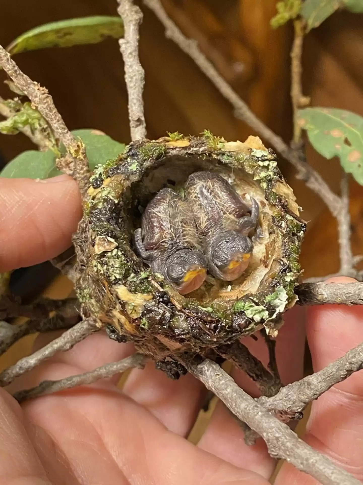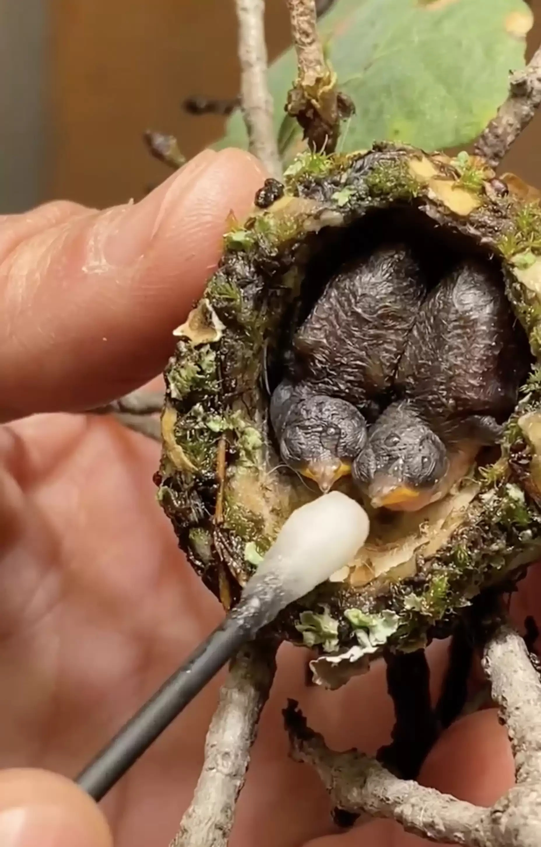 ▼蜂鳥寶寶破殼幾天後,當地遭遇一場暴風雨。蜂鳥媽媽無力支持,只能放棄鳥巢和幼鳥,獨自離開了。Sabine和Deborah不忍看著2隻幼鳥失去生命,決定伸出援手。