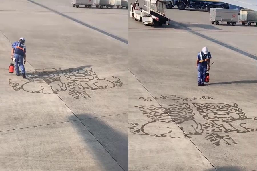 ▼一名網友3月31日在Twitter上發文說,收到友人傳來的影片,只見在沖繩的那霸機場,因為班機延誤,一名地勤人員竟拿起水槍上演「畫畫秀」。他現場畫出2隻巨型風獅爺,並寫下文字向乘客們致歉,最後還對著乘客90度鞠躬。