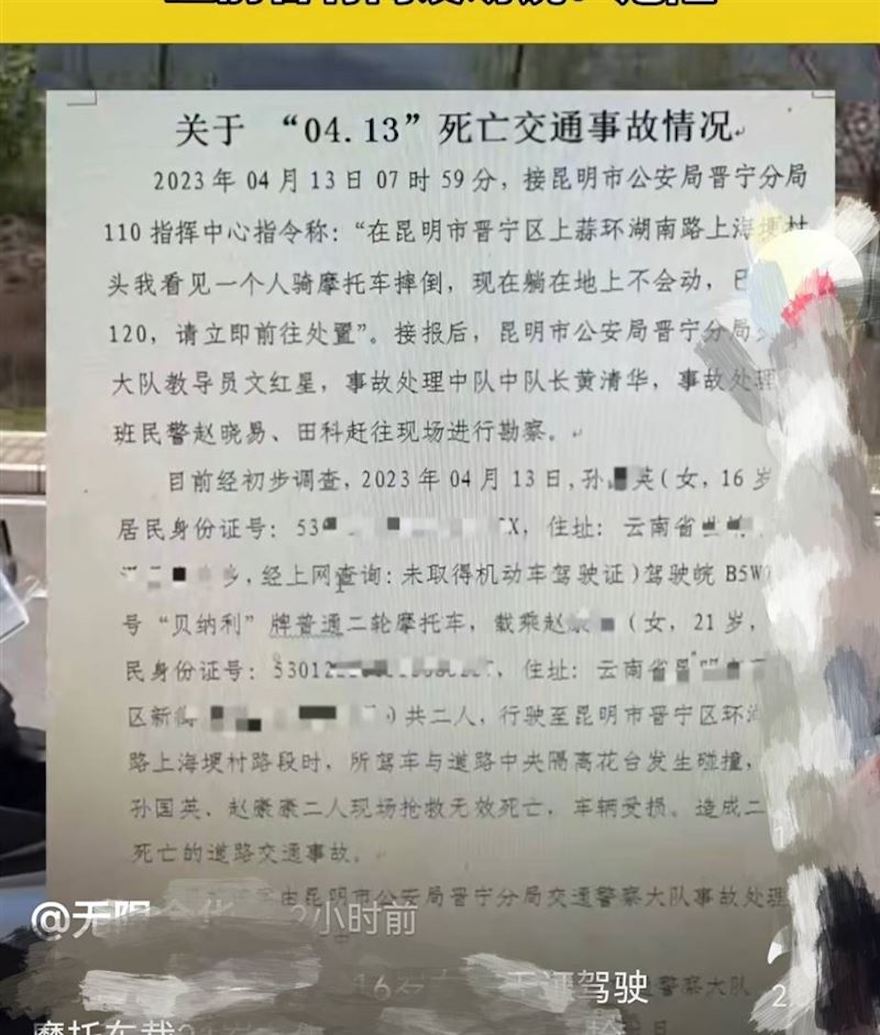 ▼昆明市晉寧分局交警指出,這一事件發生於4月13日上午7時許,他們接獲通報,在晉寧區湖南路海梗村路段,有騎士載人自撞分隔島,摔倒後躺地不起。警方趕到現場並緊急搶救,但還是無法挽回兩人的生命。