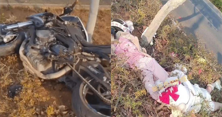 ▼車禍現場的照片中,騎士的裝扮非常特別,眼尖的網友立刻認出她是「小嬌妻」。警方也確認,騎士就是16歲的孫國英(小嬌妻),她沒有機車駕照,當天載著21歲的友人趙康康外出,結果自撞上分隔島後摔車,2人都當場死亡。