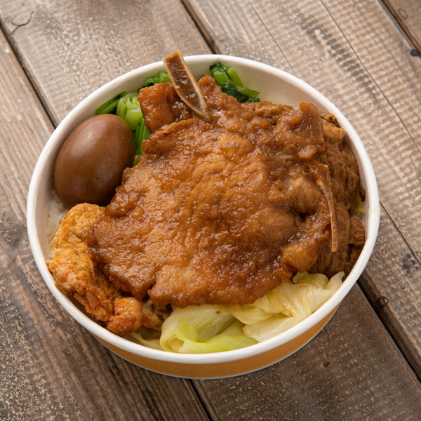 老闆還說,店內還有一個選項叫做排骨便當,1個主菜搭3個配菜,菜單上就在排骨飯下面,價格只差20塊:「80塊一個飯100塊一個便當,它加20塊就三樣配菜,20塊三樣配菜,沒有了吧,你去自助餐隨便夾個菜都100多元去了。」