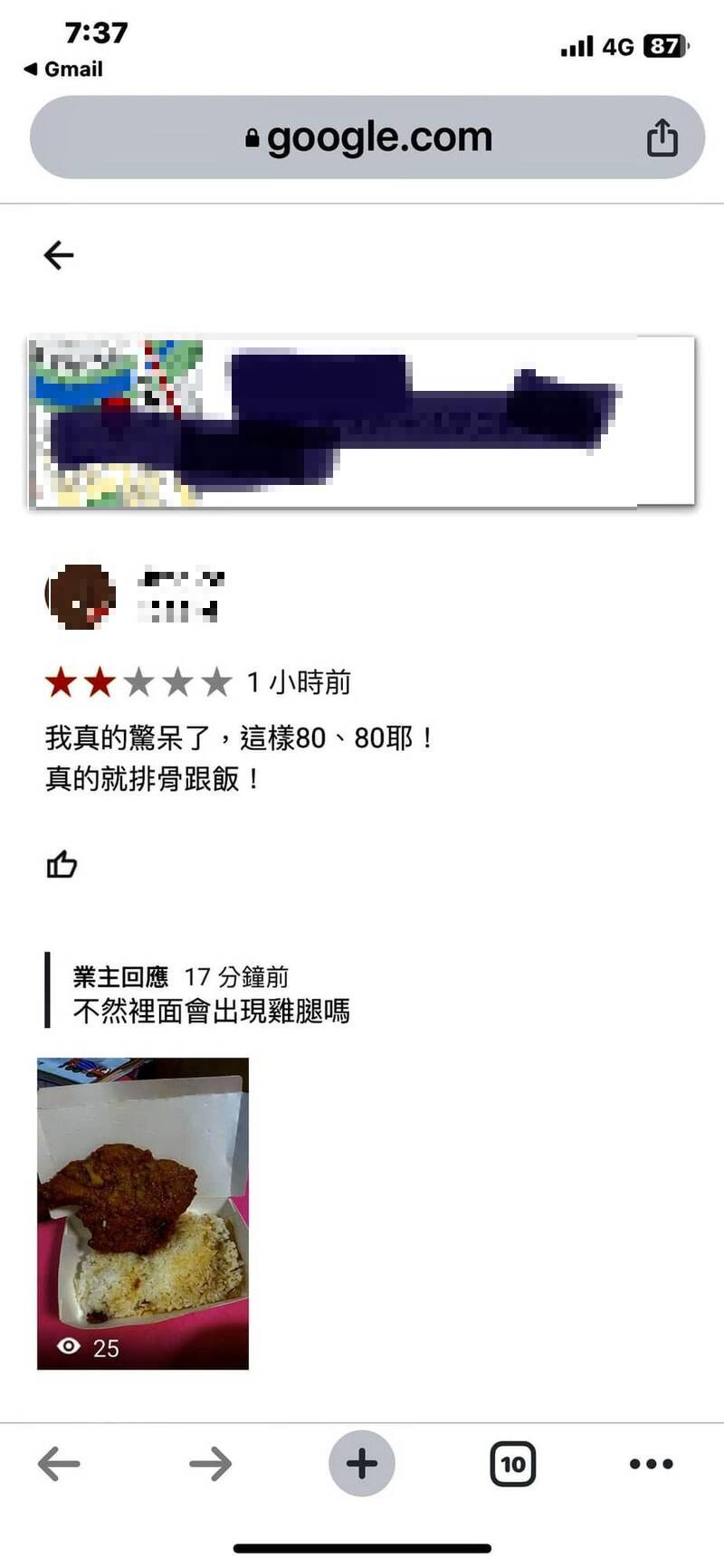 ▼原po在臉書社團「爆怨公社」發文抱怨說,她在一間店買了一份80元的排骨飯,回家打開便當盒就真的只有排骨跟飯,沒有配菜。她在Google評論留言,老闆則在評論底下回覆:「不然裡面會出現雞腿嗎?」