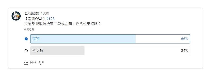為了改善機車事故,交通部擬部分取消機車兩段式左轉。近日Youtube頻道《老天鵝娛樂》發起「交通部擬取消機車二段式左轉,你各位支持嗎?」網路投票,短短幾天就有6萬多人參與,其中多達66%的網友支持取消,另外34%網友則不支持。