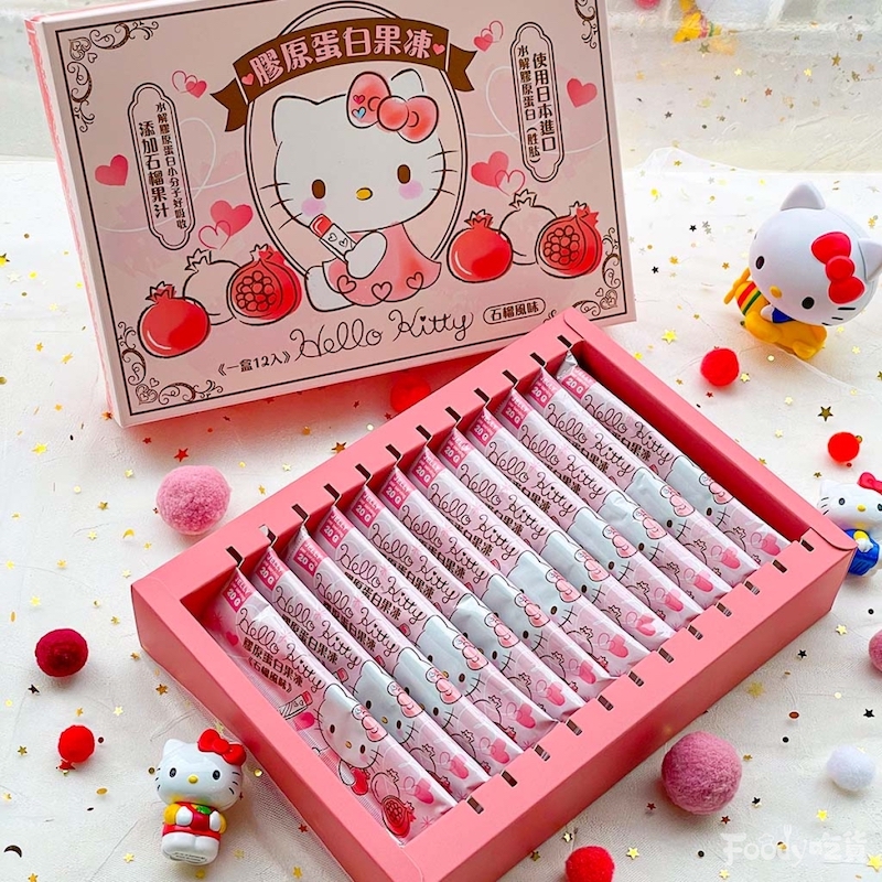 ▼「Hello Kitty膠原蛋白果凍」是粉紅色手提禮盒包裝,盒子上印有Hello Kitty的圖案,裡面的果凍則是可愛的Hello Kitty個別包裝,從內到外全都是Kitty,只看就覺得超療癒!果凍富含膠原蛋白和酸甜的石榴果汁,入口酸酸甜甜,十分清爽,QQ的口感順滑好吃!原價489元,現在只要299元,快趁特價優惠吃起來