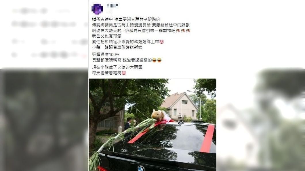 原po在臉書社團「爆廢公社」發文說,在婚俗古禮中,禮車旁要綁上甘蔗、竹子和豬肉。據說綁豬肉是因為古時候迎親之路漫漫,特別是走山路時可能會遇到野獸,要餵給牠們報平安。現在時移勢易,但這一習俗卻保留了下來。