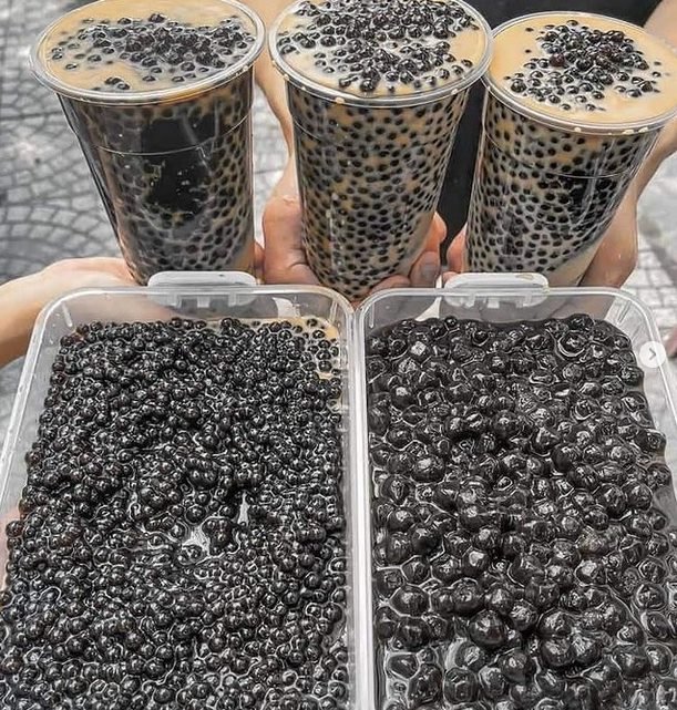 ▼從照片中可以看到,前方有兩盒裝有大珍珠和小珍珠的保鮮盒,後方則有人拿著三杯珍珠加到爆滿的奶茶。普通的珍奶中,珍珠最多加一半,照片中的這幾杯卻滿到最上層都有,讓人懷疑這幾杯中到底還有多少奶茶。