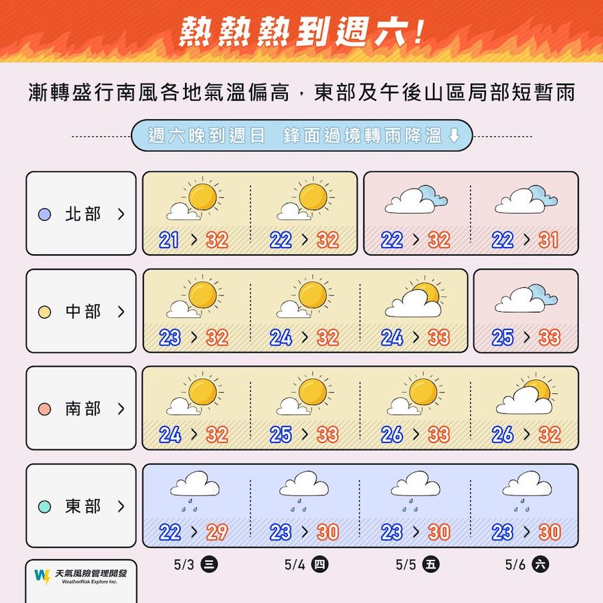 ▼天氣風險在臉書表示,今天各地氣溫持續偏高,除了東半部地區高溫大約在29到30度左右,其他地區都將來到30度以上。明天到週五各地維持類似的天氣型態,普遍多雲到晴,午後山區零星短暫陣雨,各地氣溫仍舊偏高,南部內陸地區將有持續達到36度高溫的機會。