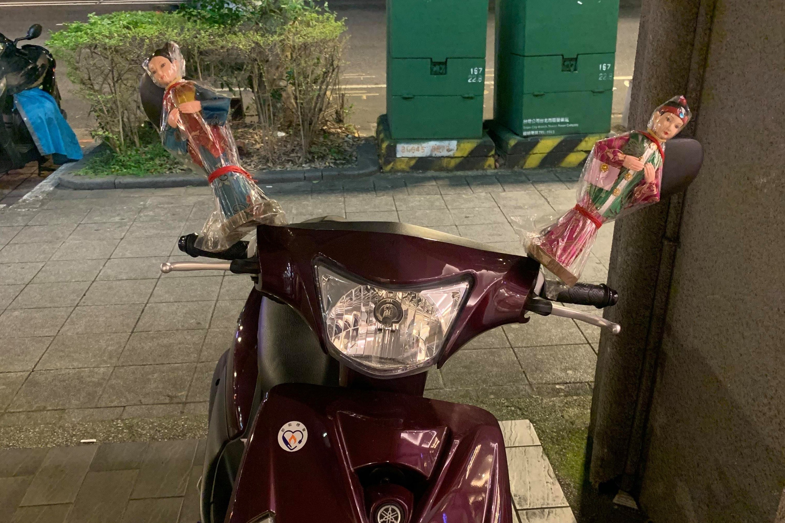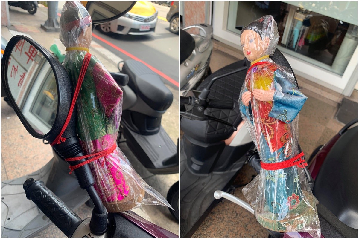 日前一名女網友發文說,她擔心外出迷路,於是向學長問路。學長不僅熱心回答,還在她的機車後照鏡綁上一對「金童玉女」,說是要「幫妳引路帶路」。雖然學長是好意,但女網友還是覺得很怪,她越騎越毛,「我怕下秒進入異世界」。