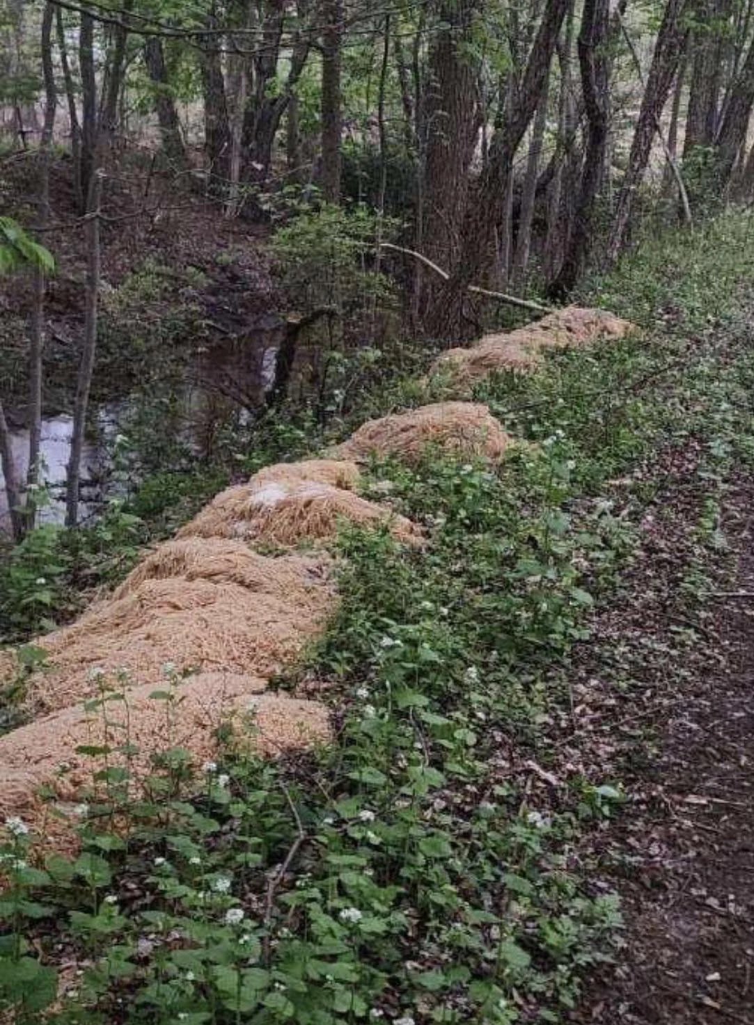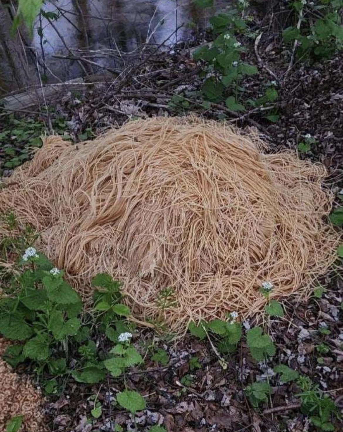 ▼當地居民表示,該地區沒有專屬的垃圾場,可能有人直接用這種「傳統方式」,把過期的義大利麵丟在野外處置。那些被傾倒在森林中的麵條都是生的,因為被傾倒的位置靠近森林的小河邊,所以麵條開始出現軟化。當地市府獲報後,派遣工程人員使用小型挖掘機,花了2個小時清理這些麵條,目前已經清理乾淨了。