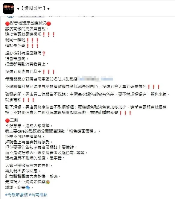 2023年05月15日母親節前夕,有民眾在台南知名蛋糕店訂購了一款粉紅色的「鏡面蛋糕」,一個要價1520元,沒想到取貨時粉紅色蛋糕竟變成橘色。他致電店家反映,但店員態度差勁,氣得他上網po文,爆料自己買到「糕王」、「被詐騙」。店家2天後發布道歉聲明,並還原整起事件過程。