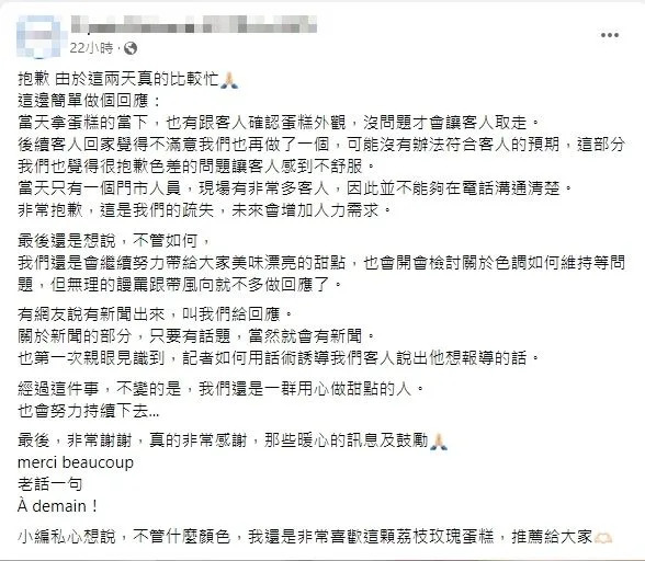 ▼對此,店家在臉書粉絲團發布道歉聲明,並說當天客人來取蛋糕時,有互相確認蛋糕外觀,沒問題才取走,後續對方回家覺得不滿意,直到傍晚再來電,他們也答應可以換,並重做了一顆。不過客人一直詢問顏色問題,當天只有一個門市人員,要處理現場客人、又要在電話中解釋,才會請客人直接到現場再幫忙想辦法,「很急所以電話掛得很快」不是故意。