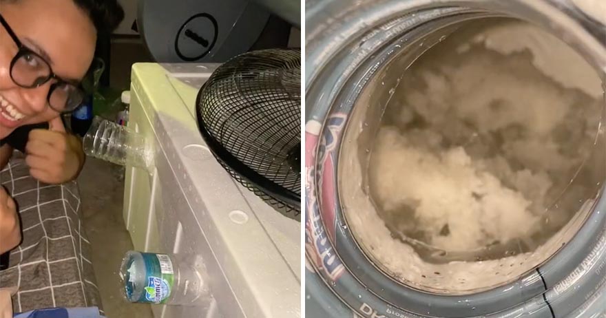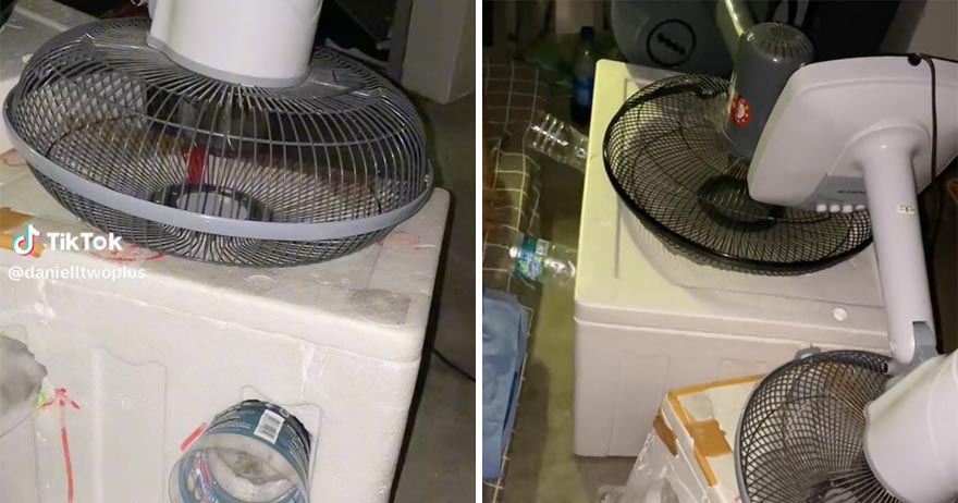 ▼Daniel在TikTok上秀出他與室友的傑作,表示他們花馬幣30令吉,買來保利龍盒、冰塊、塑膠瓶和鹽,然後將這些物品與宿舍提供的電風扇組裝在一起,自製成了環保、便宜又好用的「DIY冷氣」。這段影片引發關注,不少網友按讚,為他們的聰明創意驚嘆。