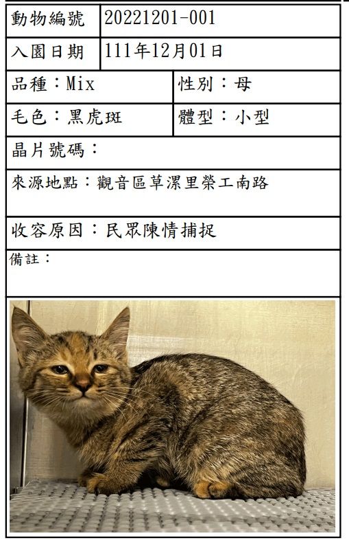 ▼桃園市動保處每天都會在官網公布當日收容的動物名單,一隻體型嬌小的黑虎斑幼貓在12月1日入園。這隻母貓是由民眾陳情捕捉,從觀音區草漯里榮工南路誘捕帶回的,動物編號為20221201-001。