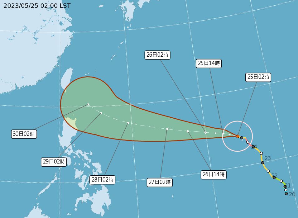 2023年05月25日颱風瑪娃24日因雙眼牆置換,一度從強颱減弱為中颱,現在重新開眼並出現「愛心眼」,預計接下來有機會增強回強烈颱風,並往西北西移動,在下週日或下週一達到最大強度,直到靠近台灣才會逐漸減緩並北轉,對台灣影響還待觀察。