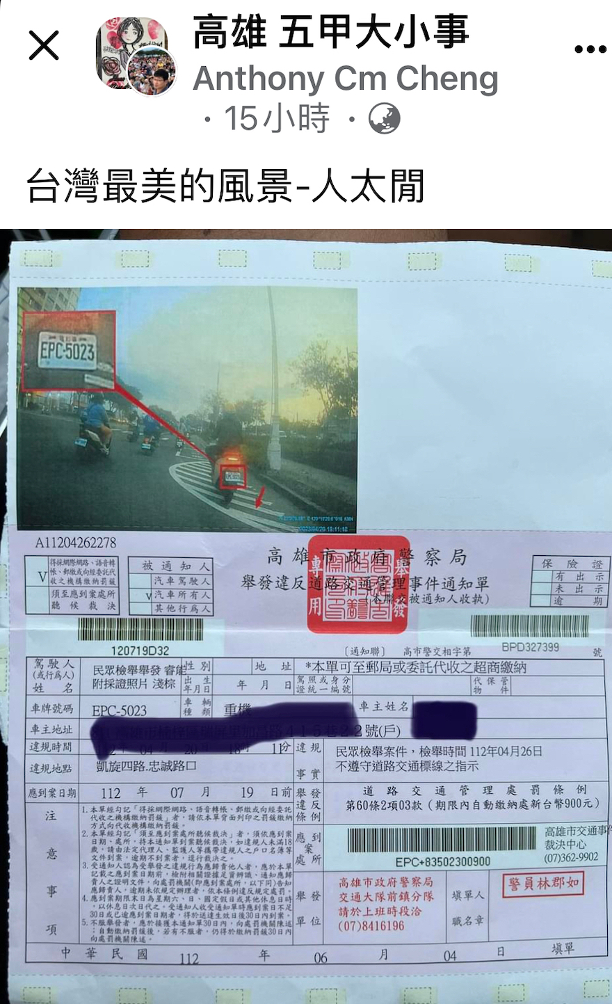 日前一名騎士騎車行經高雄凱旋、忠誠路口時,依規定待轉,沒想到後來竟收到一張900元的罰單。原來他彎進待轉區時壓到槽化線。騎士非常生氣,拍下罰單po上網,並大罵「台灣最美的風景-人太閒」。這件事引發討論~