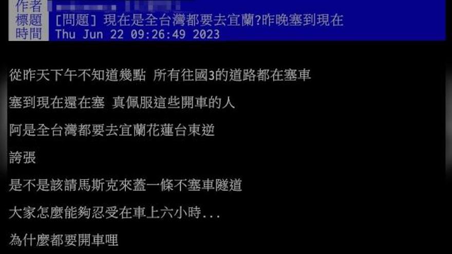 2023年06月25日端午連假期間,很多人會與家人一起出遊,塞車在所難免。一名網友在PTT發文說,連假前一天下午,往國三的道路都在塞車,甚至一路塞到22日,讓他非常佩服開車的駕駛們。他忍不住直呼,全台人是不是都跑到宜蘭、花東、台東旅遊了,「怎麼能夠忍受在車上6小時,為什麼都要開車」?