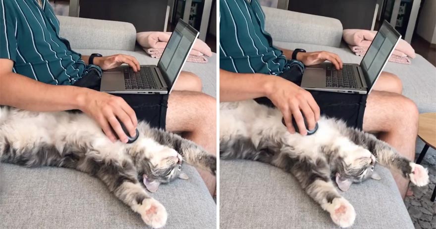 ▼從影片中可以看到,Dibster呈大字型,翻肚躺在爸爸身邊,就像一塊毛茸茸的滑鼠墊。牠全身躺平,任由爸爸拿著滑鼠在自己身上移動,還舒服到瞇起眼睛,那享受的模樣讓爸爸也忍不住露出笑容。