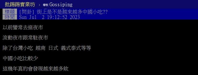 2023年07月04日台灣夜市能夠看到各種各樣的美味小吃。日前一位網友在PTT好奇發問:「街上是不是越來越多中國小吃?」他表示以前夜市上常見的都是台灣小吃、越式、日式、泰式或義式料理,幾乎不見中國小吃,但最近逛夜市發現「中國小吃越來越多」。他還看到一家攤販售「冰粉」,根本不知道是什麼食物,上網一查發現都是抖音推薦美食。