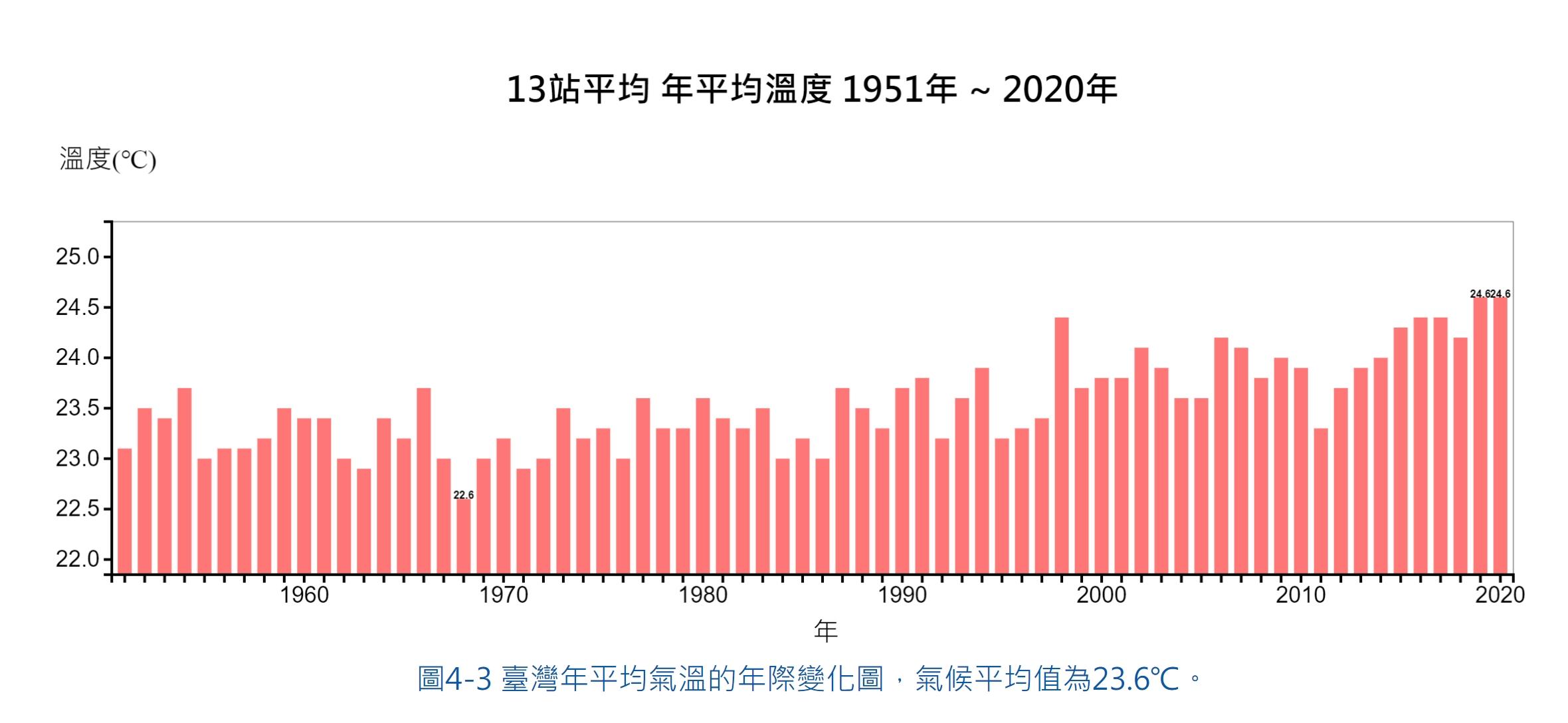 ▼在「日均溫」方面,最高為2009年8月2日新竹站的33.3℃。2017年8月台北站的31.1℃則是最高「月均溫」。至於「年平均溫度」,如果以13個平地氣象站平均來代表台灣,2020年是台灣氣象紀錄上最暖的一年,年平均溫度為24.6℃。